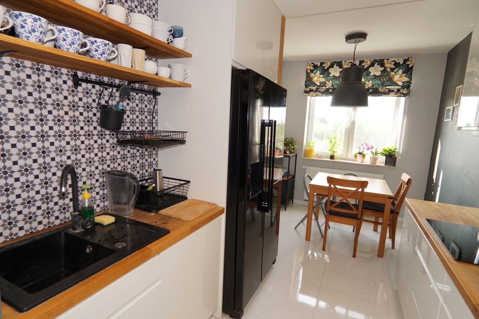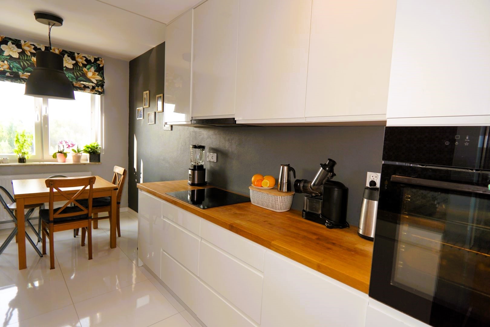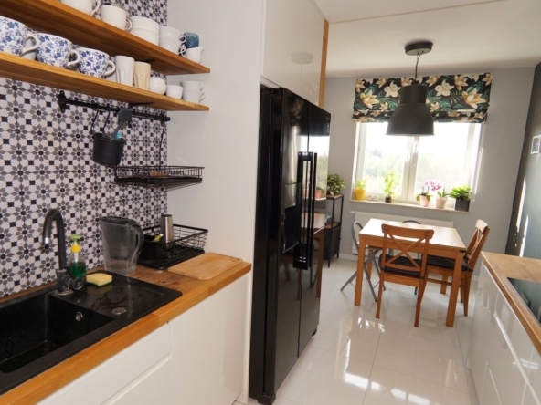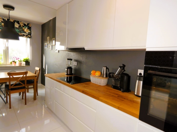 – kuchnia z meblami na wymiar oraz pełnym wyposażeniem (lodówka dwudrzwiowa, zmywarka, płyta, piekarnik, okap),